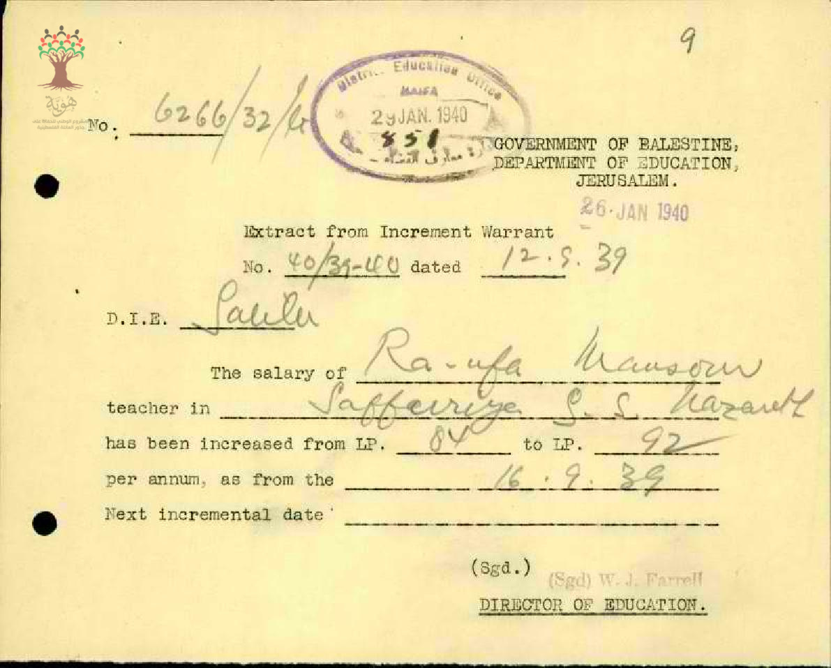رسالة من مدير المعارف الى مفتش المعارف بخصوص زيادة راتب المعلمة رؤوفة منصور السنوية
