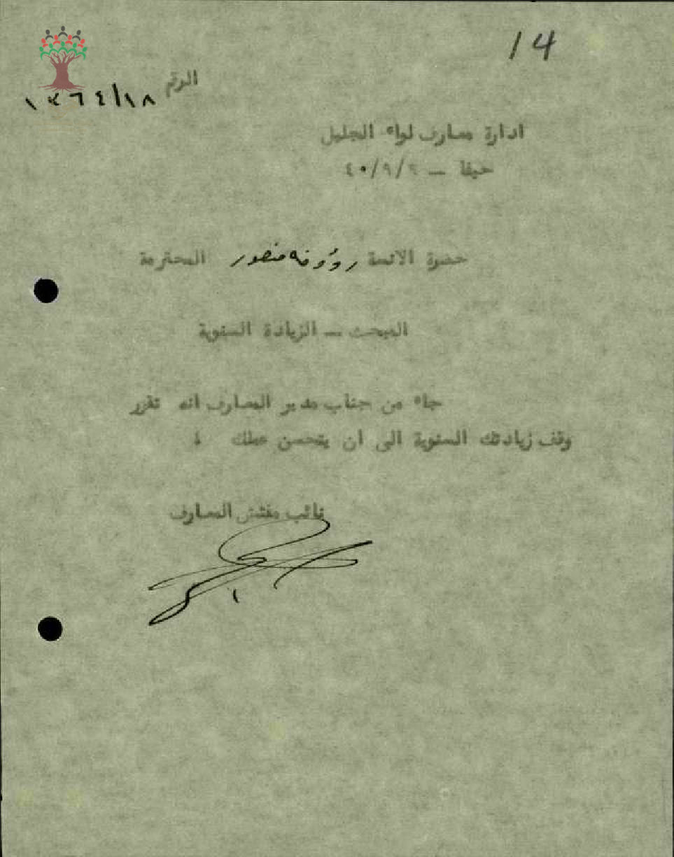رسالة من نائب مفتش المعارف الى المعلمة رؤوفة منصور بخصوص وقف زيادة راتبها