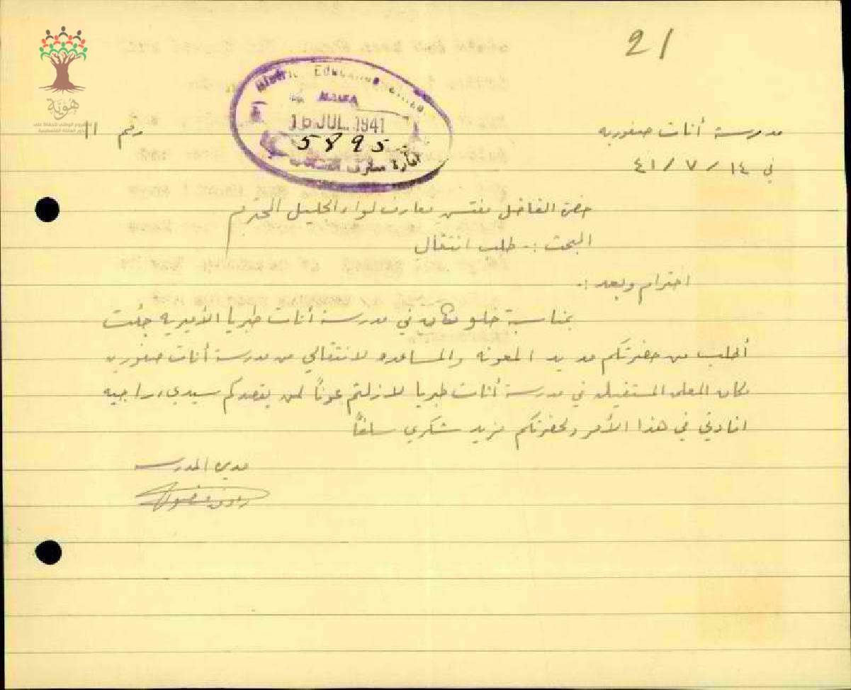 طلب نقل مقدم من المعلمة رؤوفة منصور من مدرسة صفورية للبنات الى مدرسة بنات طبريا