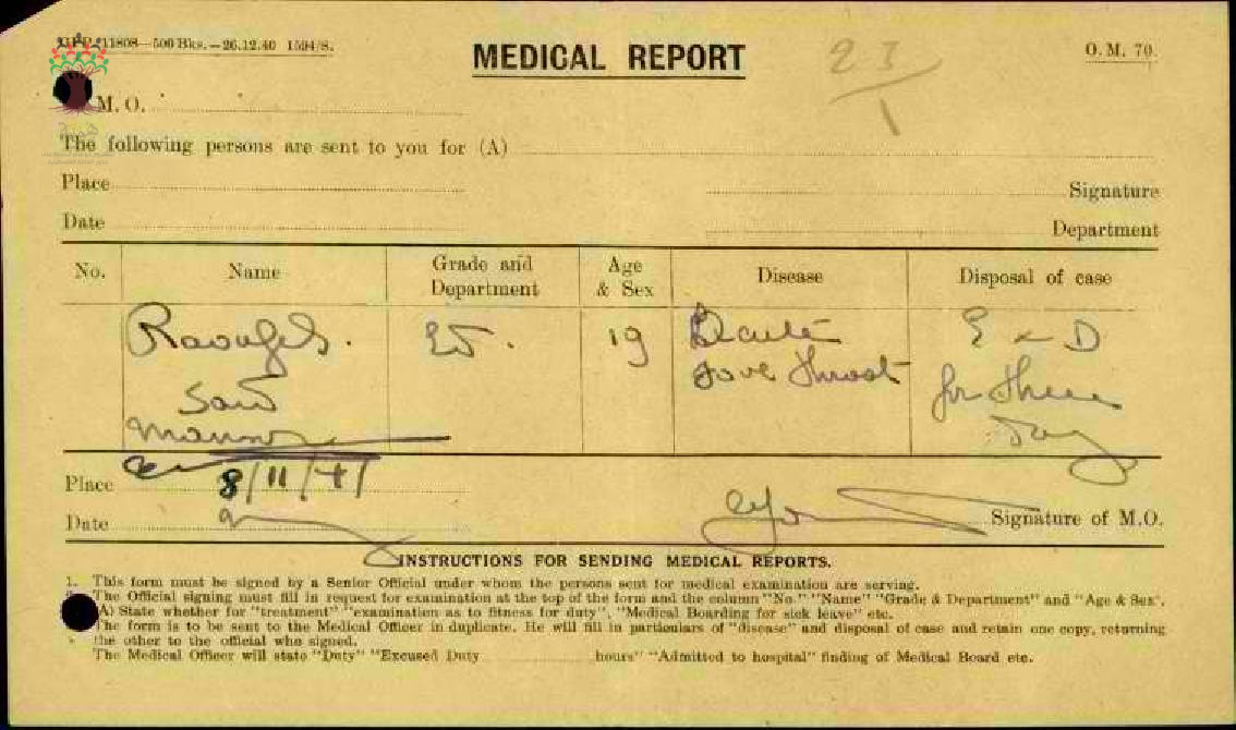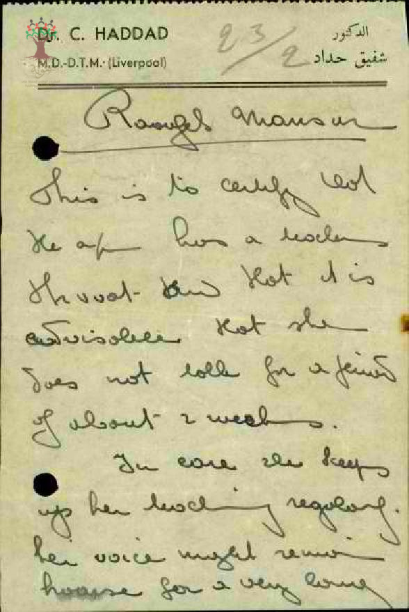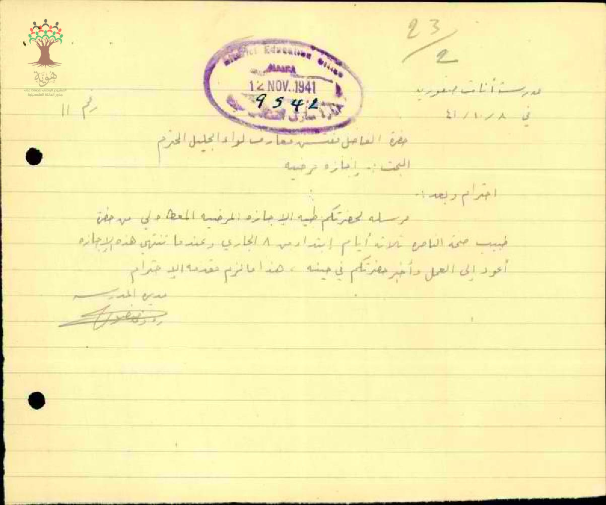رسالة من المعلمة رؤوفة منصور الى مفتش المعارف بخصوص اجازة مرضية مرفقة بالتقرير الطبي