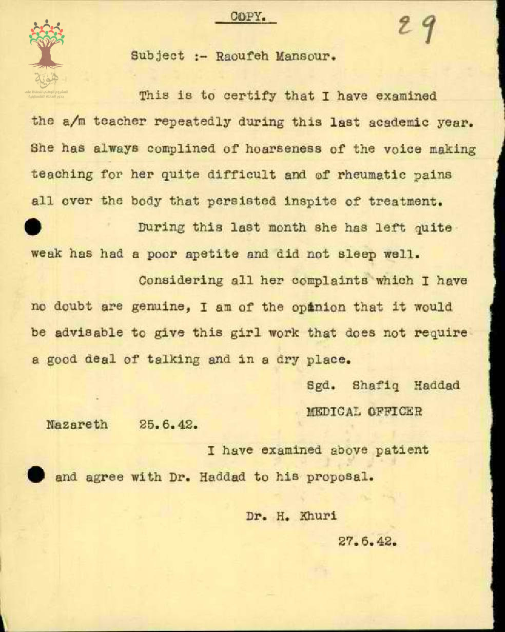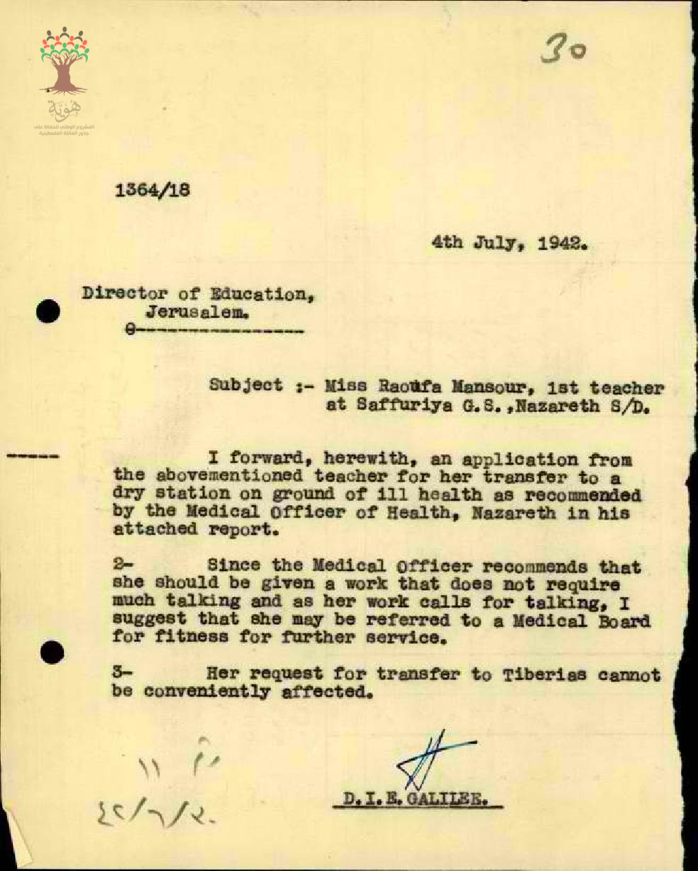 رسالة من مفتش المعارف الى مدير المعارف بخصوص طلب نقل المعلمة رؤوفة منصور مرفقة بالتقرير الطبي اللازم لضرورة النقل