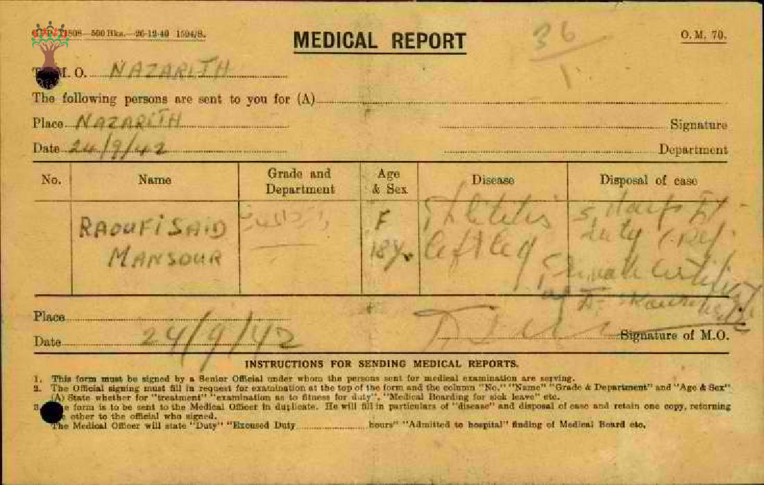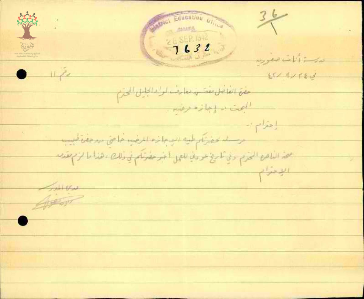 رسالة من المعلمة رؤوفة منصور الى مفتش المعارف بخصوص اجازة مرضية مرفقة بالتقرير الطبي