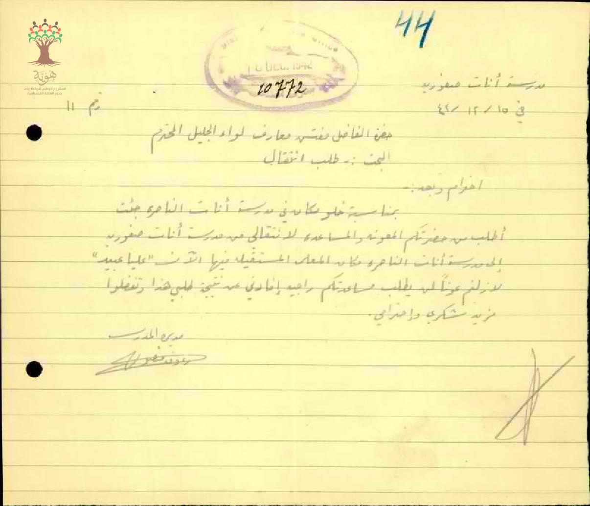 طلب نقل مقدم من المعلمة رؤوفة منصور من مدرسة صفورية للبنات الى مدرسة اناث الناصرة