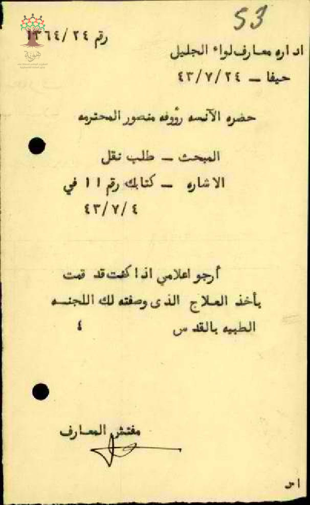 رسالة من مفتش المعارف الى المعلمة رؤوفة منصور يسألها اذا تناولت العلاج الموصوف لها