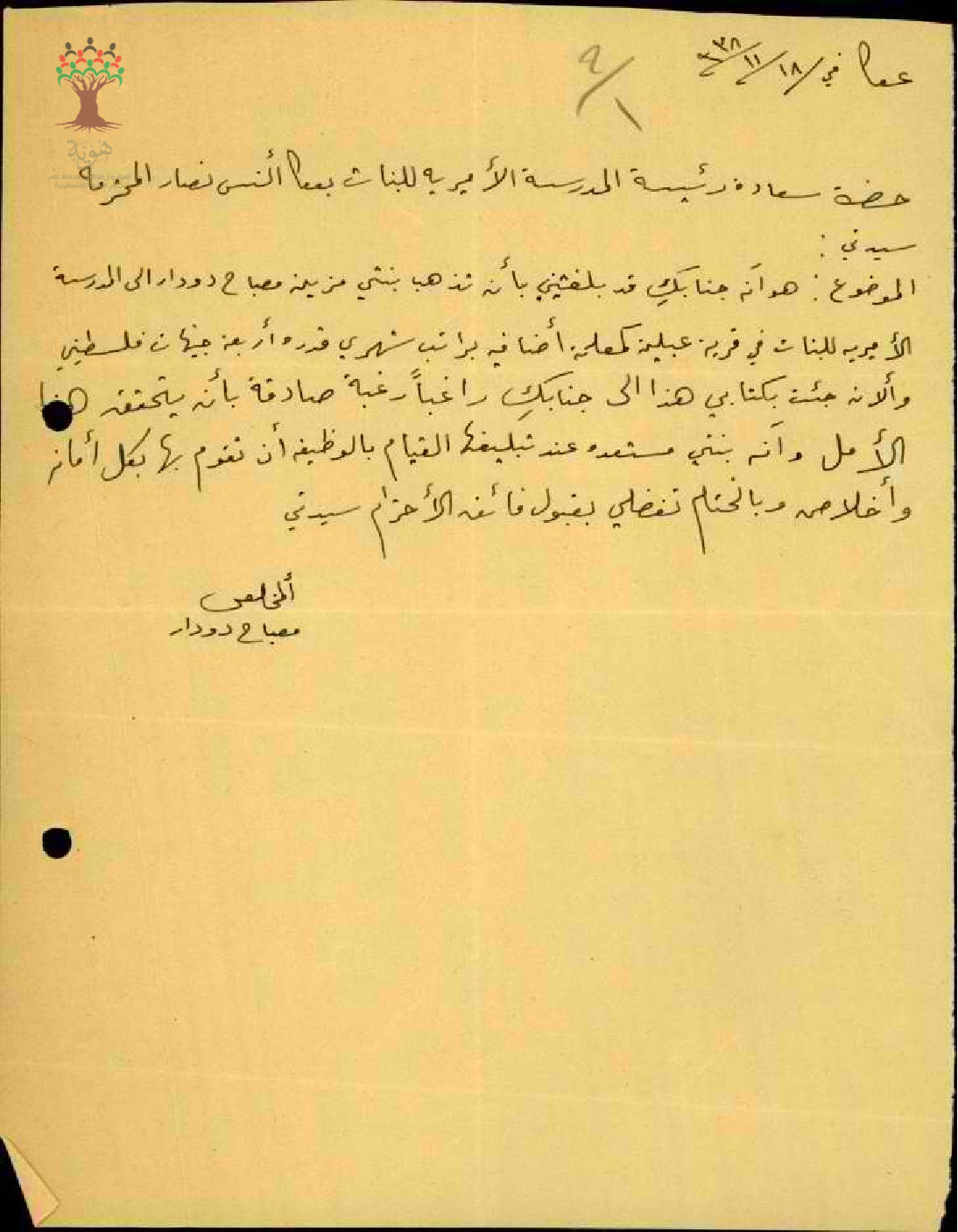 رسالة من والد المعلمة مزين مصباح دودار باستلام عرض العمل لابنته في مدرسو عبلين