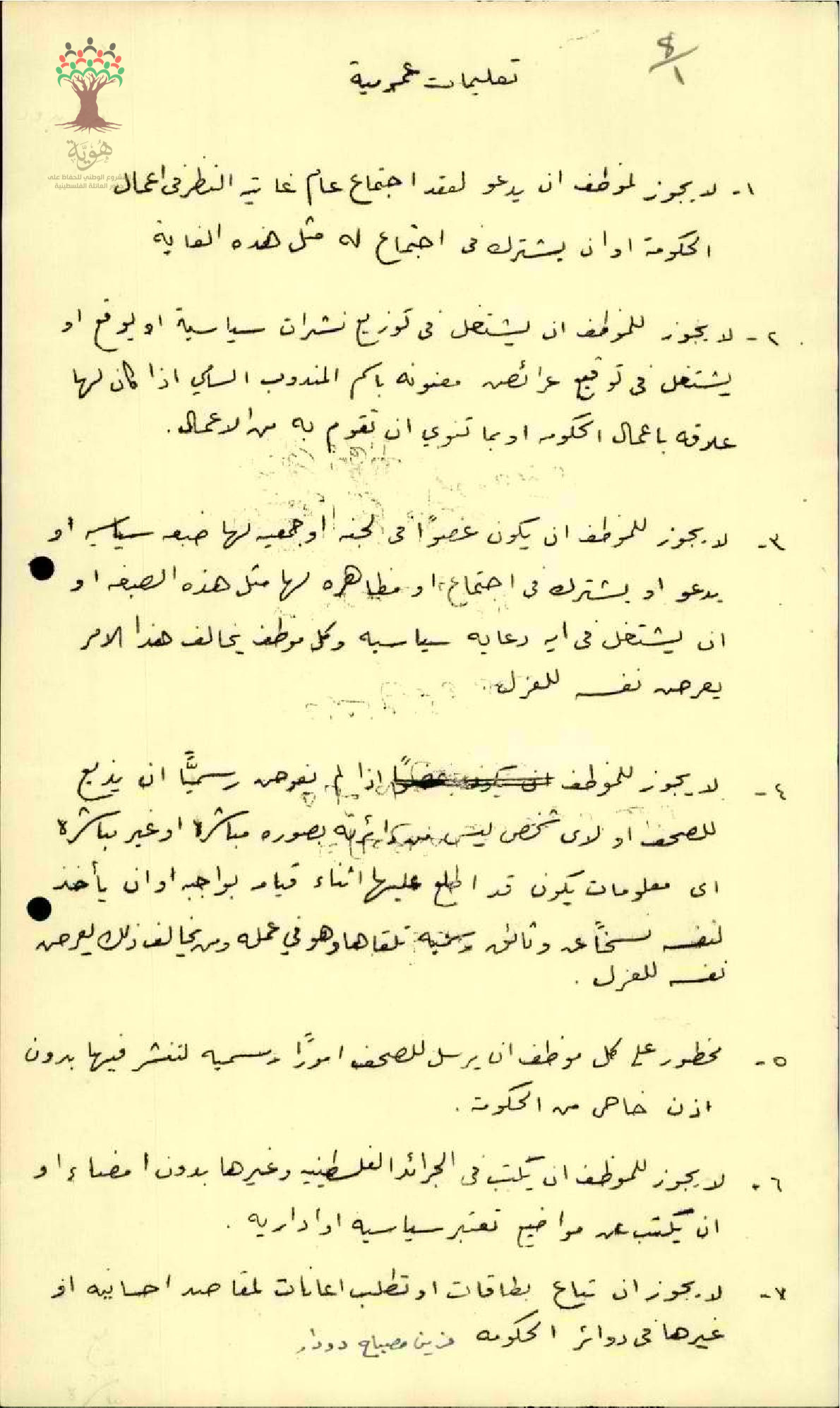 توقيع المعلمة مزين دودار على التعليمات العمومية لإدارة المعارف
