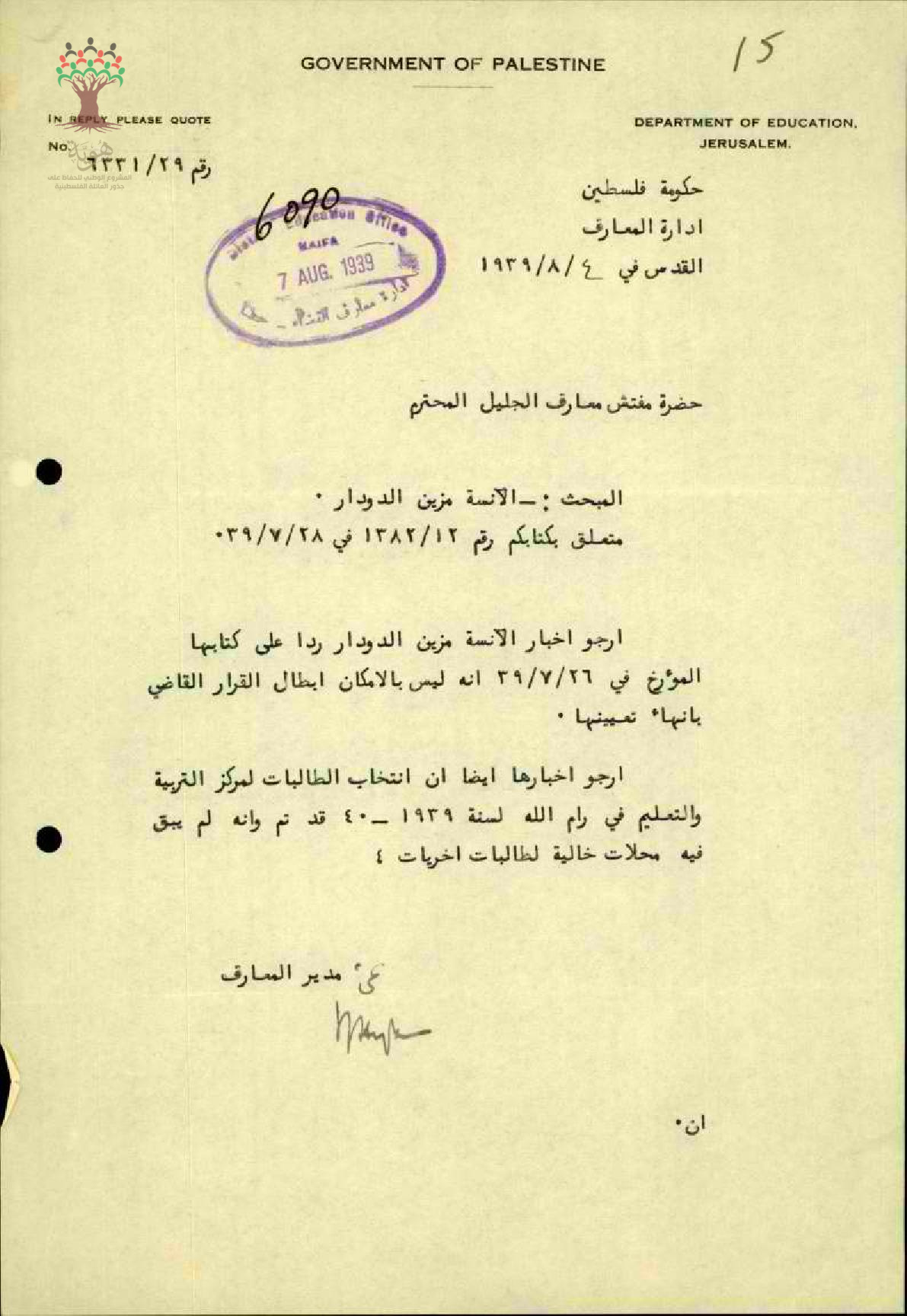 رسالة من مدير المعارف الى مفتش المعارف بخصوص رفص ابطال قرار عدم تعيينها
