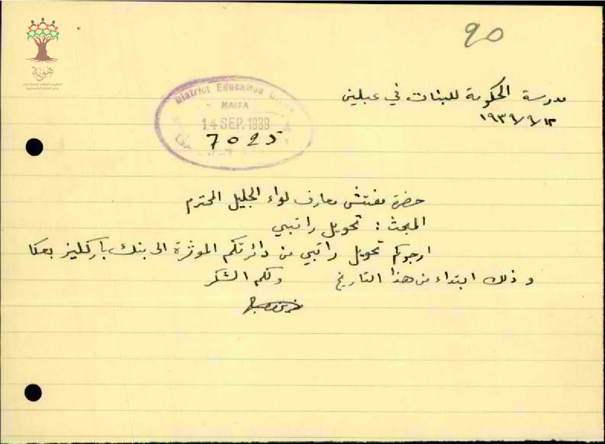 رسالة من المعلمة مزين دودار الى مفتش المعارف بخصوص تحويل راتبها
