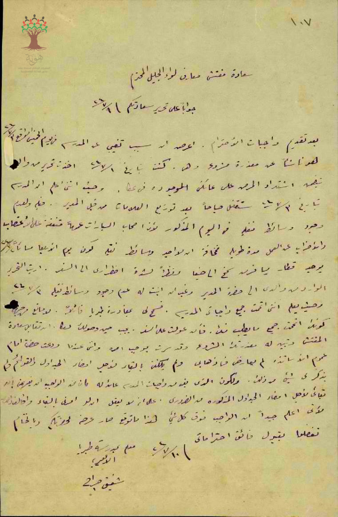 رسالة من المعلم شفيق الجراح الى مفتش المعارف يبرر سبب غيابه عن العمل يوم 3-7-1924