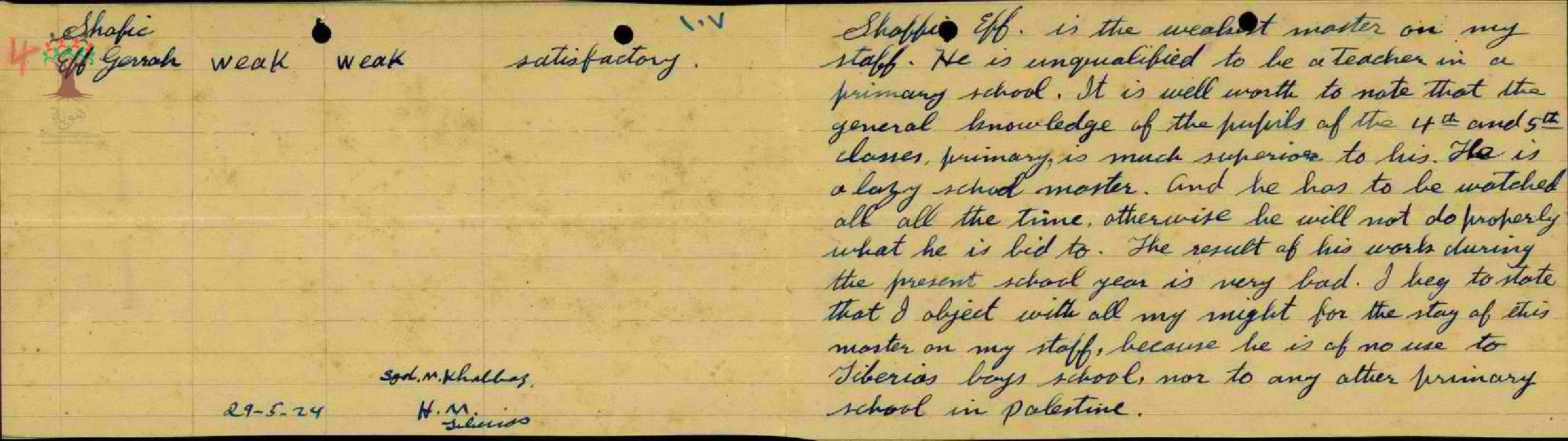 تقرير من مدير مدرسة طبريا عن أداء المعلم شفيق الجراح
