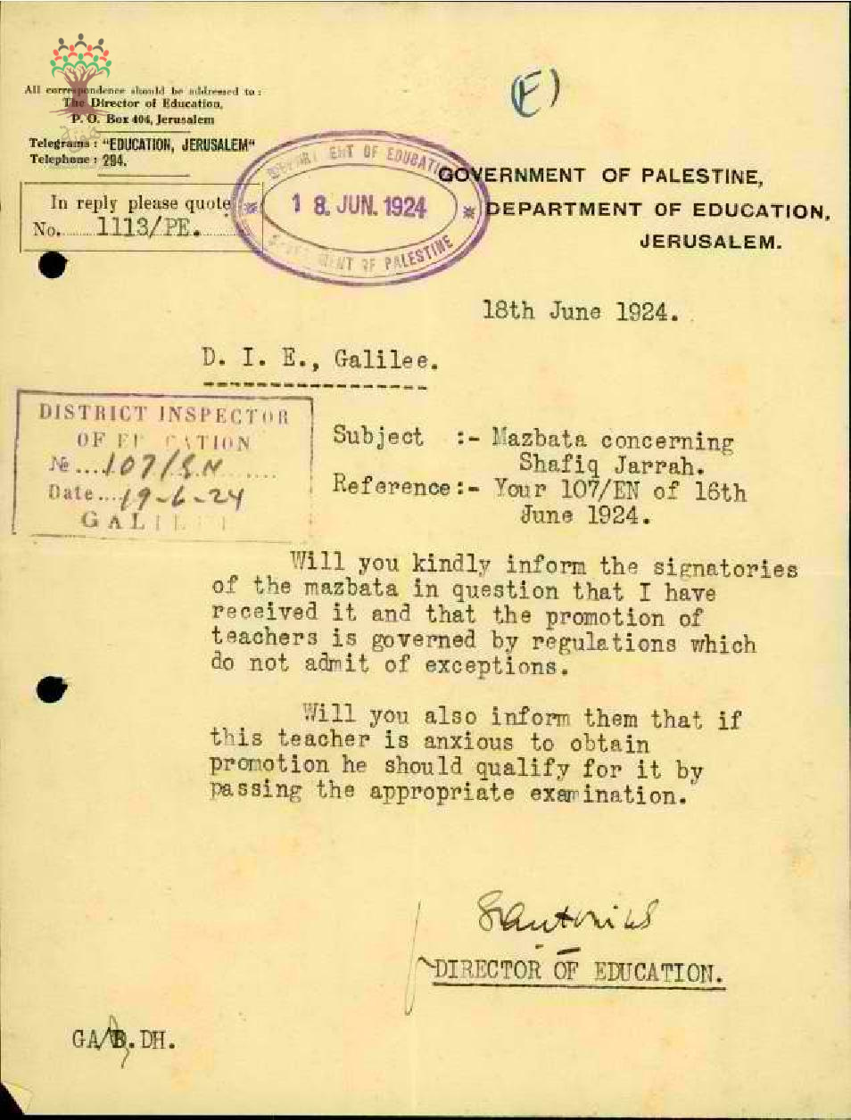 رسالة من مدير المعارف الى مفتش المعارف ليخبر المعلم شفيق جراح بضرورة تخطي فحص المعلمين اذا كان يرغب بزيادة راتبه