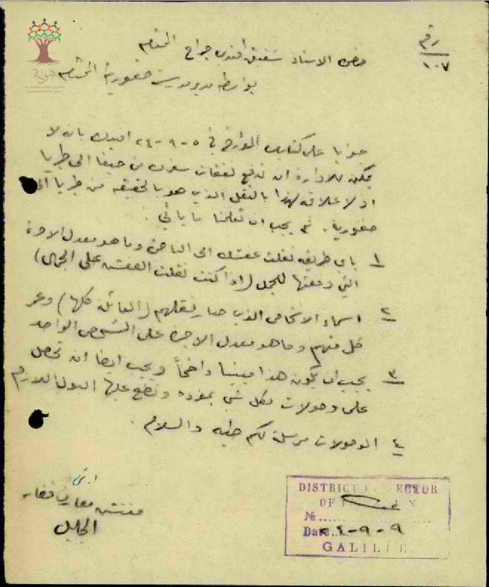 رسالة من مفتش المعارف الى المعلم شفيق جراح بخصوص عدم امكانية دفع تكاليف سفره من حيفا الى طبريا