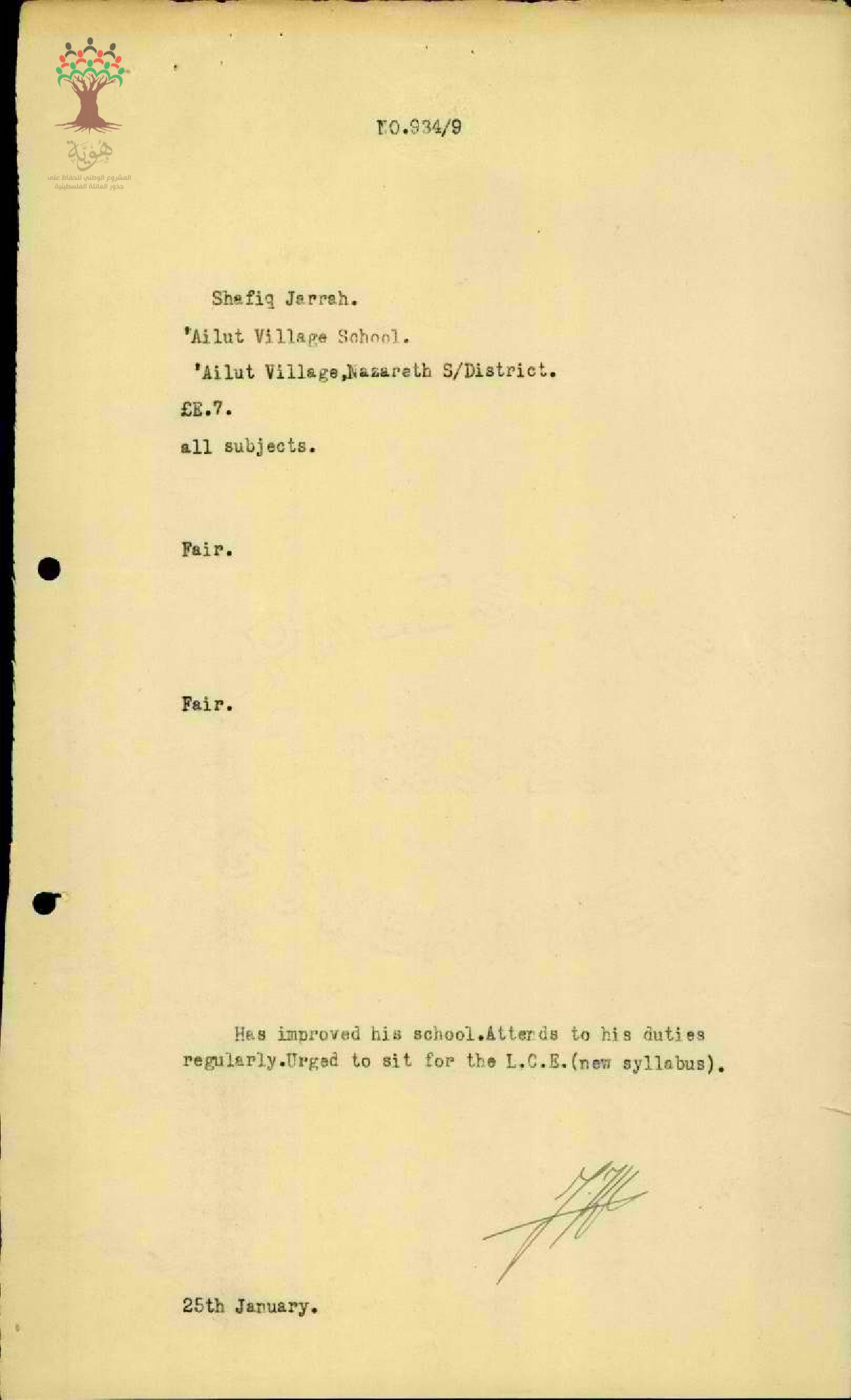 تقرير عن أداء المعلم شفيق جراح في مدرسة عيلوط سنة 1929