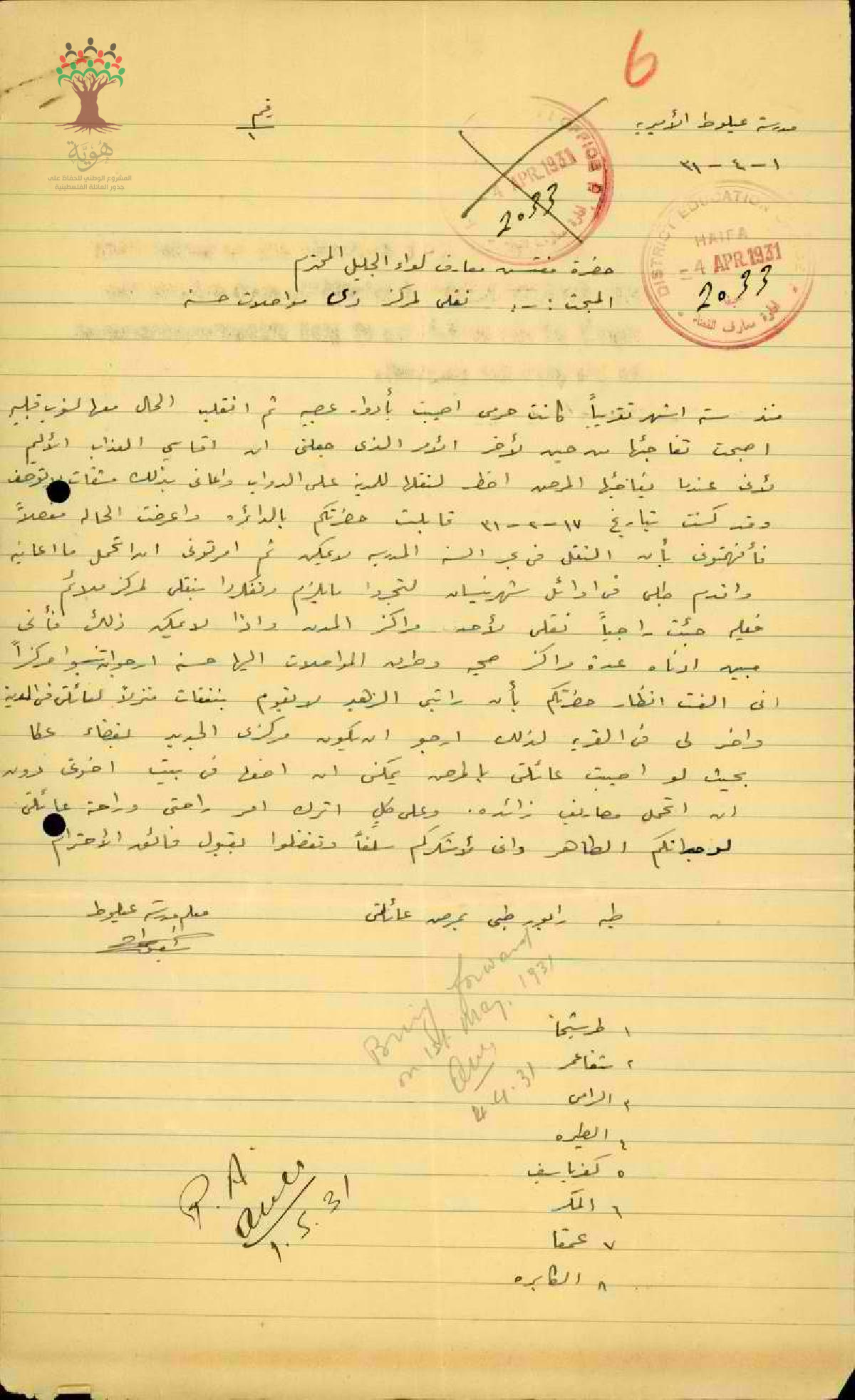 رسالة من المعلم شفيق جراح الى مفتش المعارف يطلب نقله الى مركز ذات مواصلات سهلة بسبب مرض زوجته