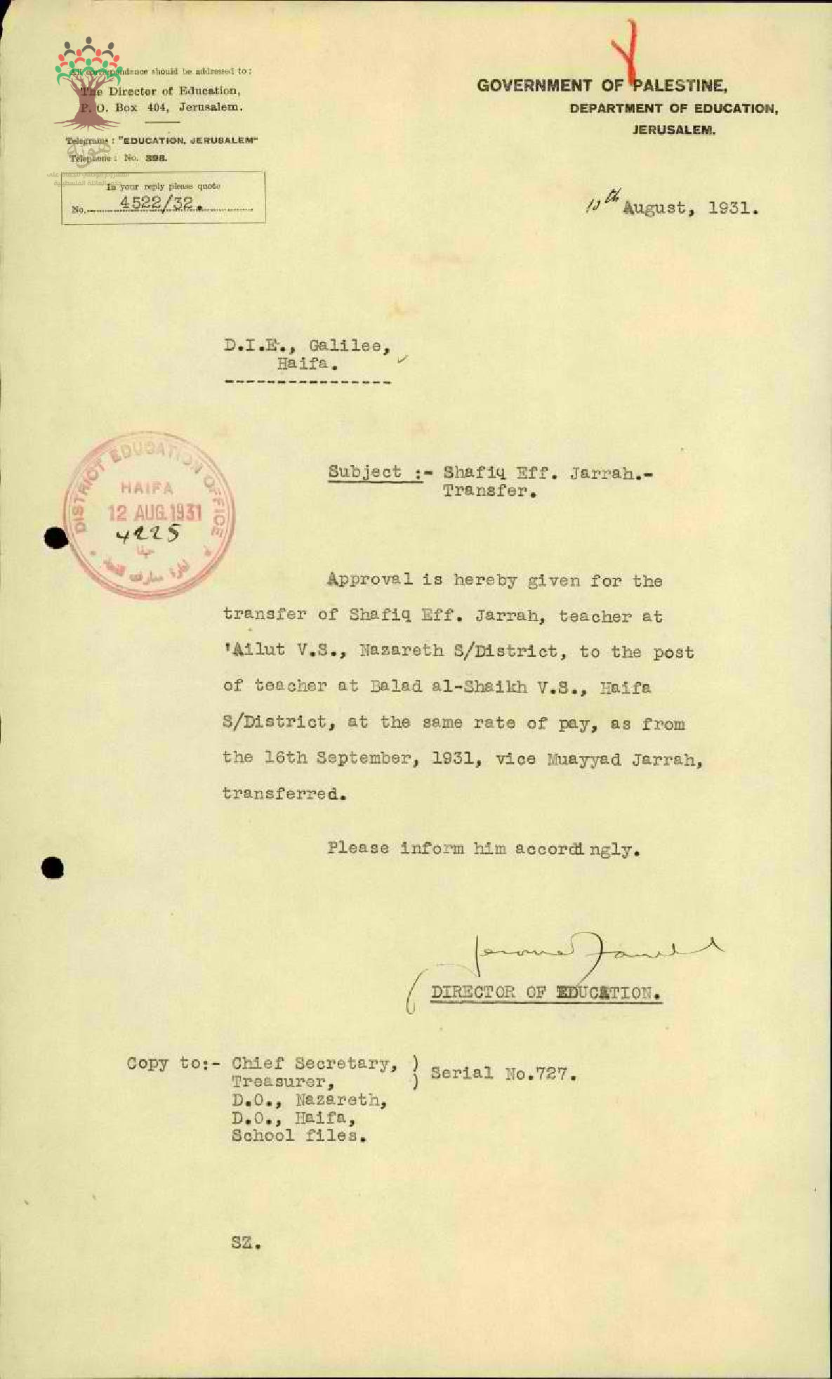 رسالة من مدير المعارف الى مفتش المعارف بخصوص الموافقة على نقله المعلم شفيق جراح الى بلد الشيخ