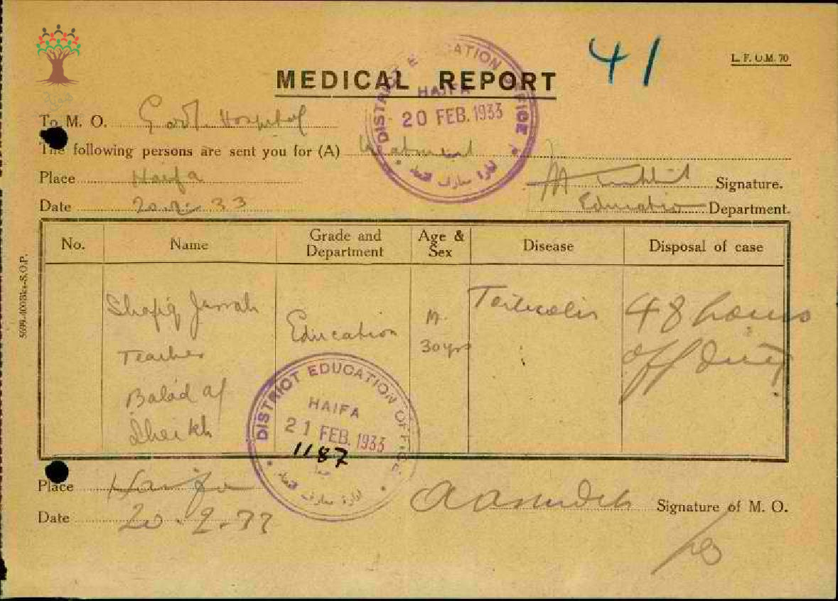 تقرير طبي عن غياب المعلم شفيق جراح-مدرسة بلد الشيخ