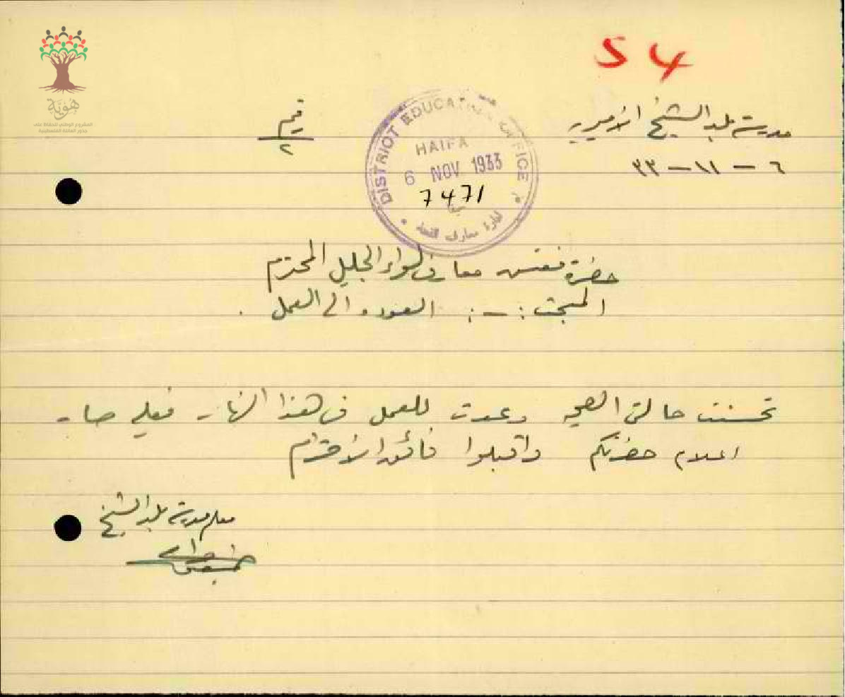 رسالة من المعلم شفيق جراح الى مفتش المعارف يخبره بعودته الى العمل