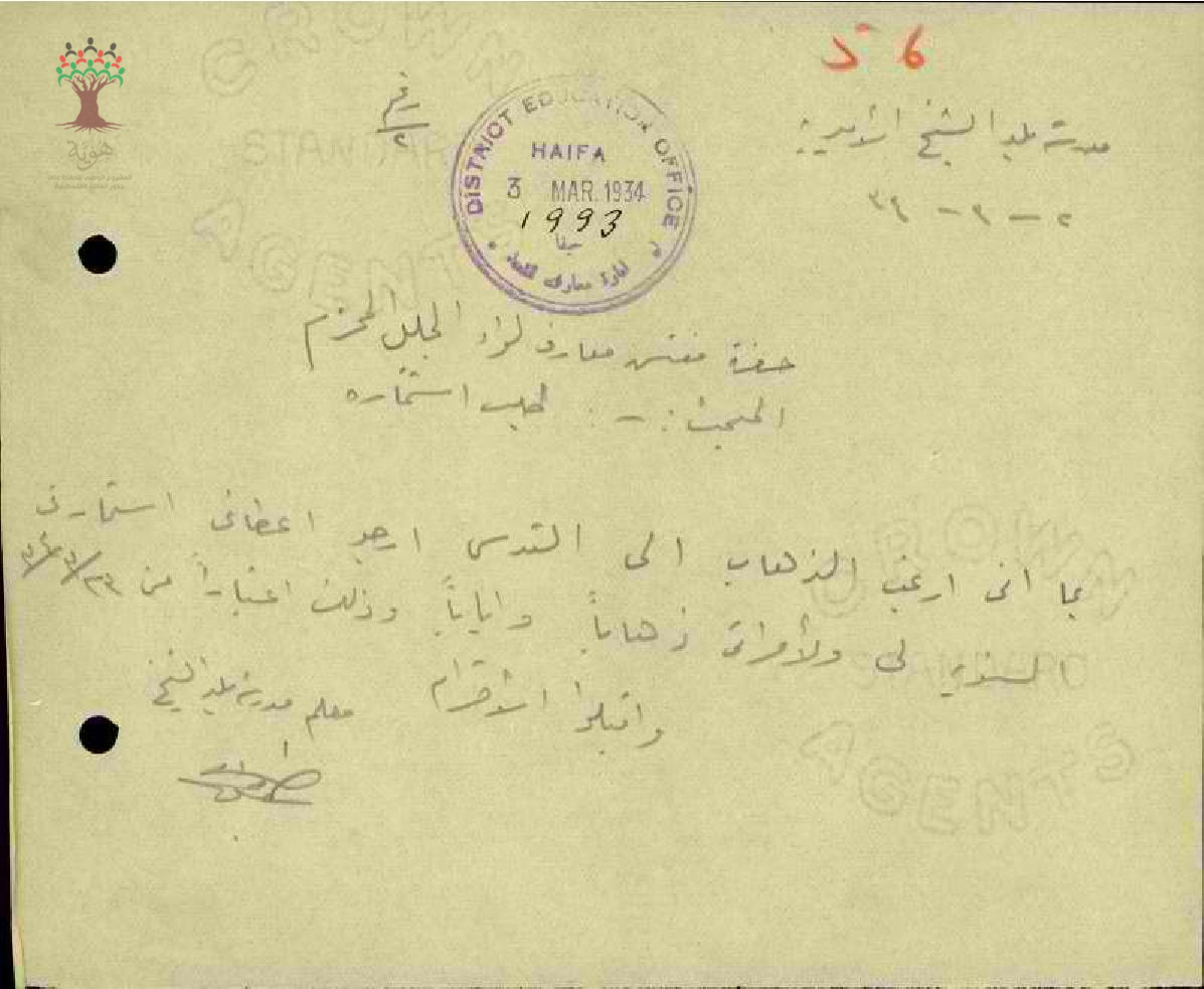 رسالة من المعلم شفيق جراح الى مفتش المعارف يطلب منه استمارته السنوية