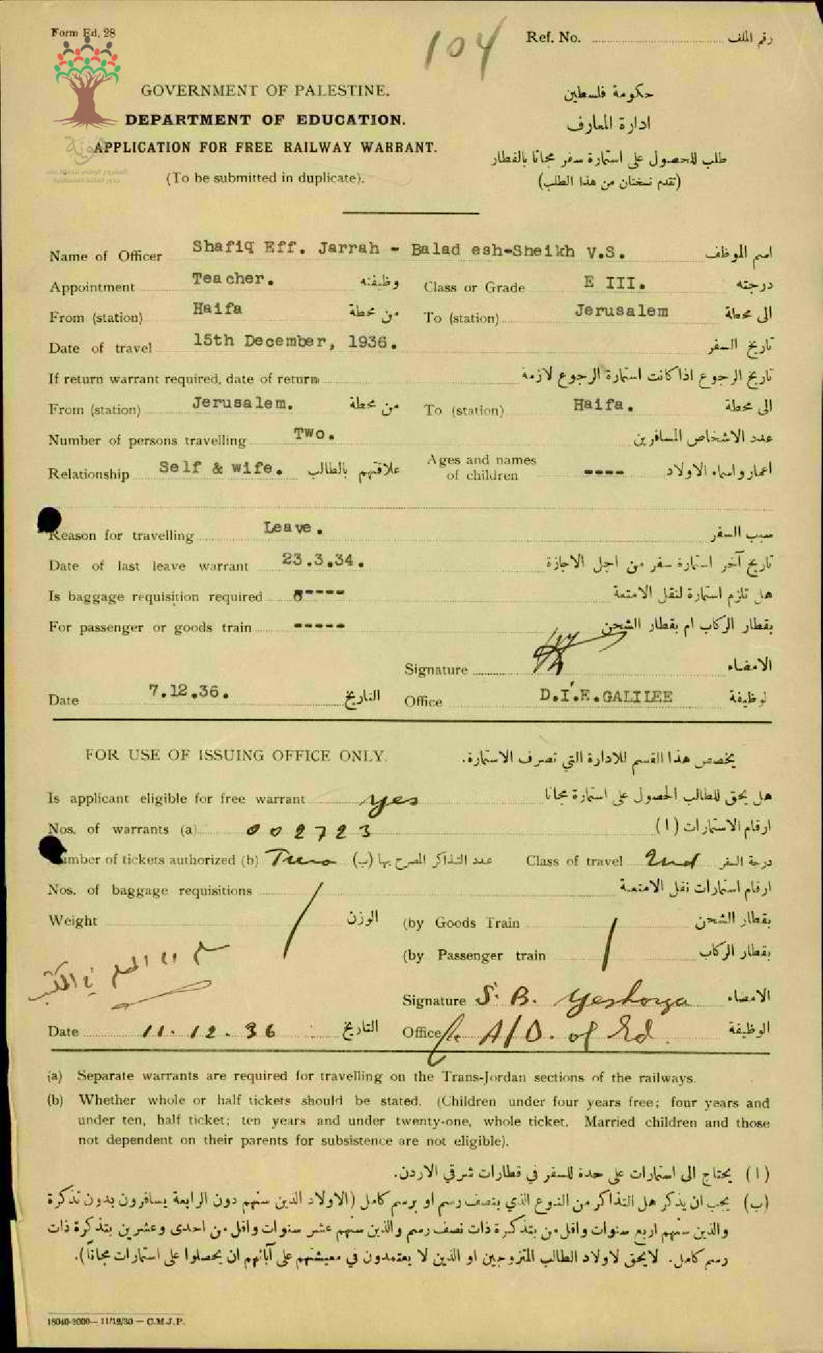 طلب استمارة سفر مقدمة من المعلم شفيق جراح/عكا