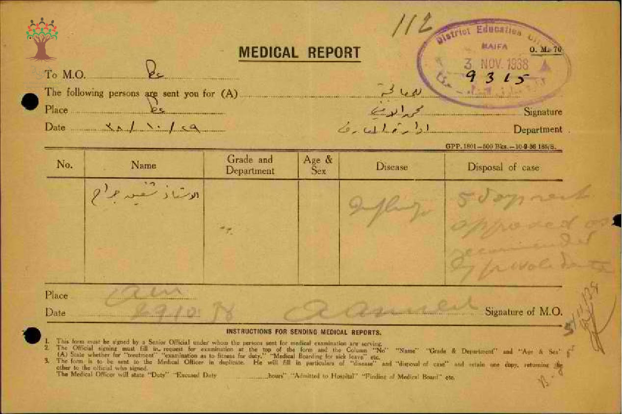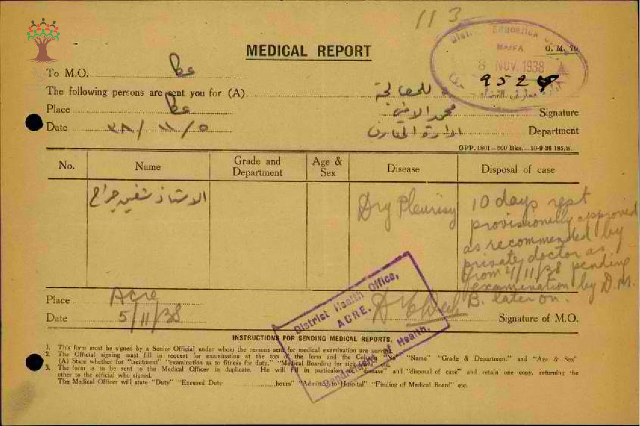 تقارير طبية عن غياب المعلم شفيق جراح مدرسة بلد الشيخ-عكا
