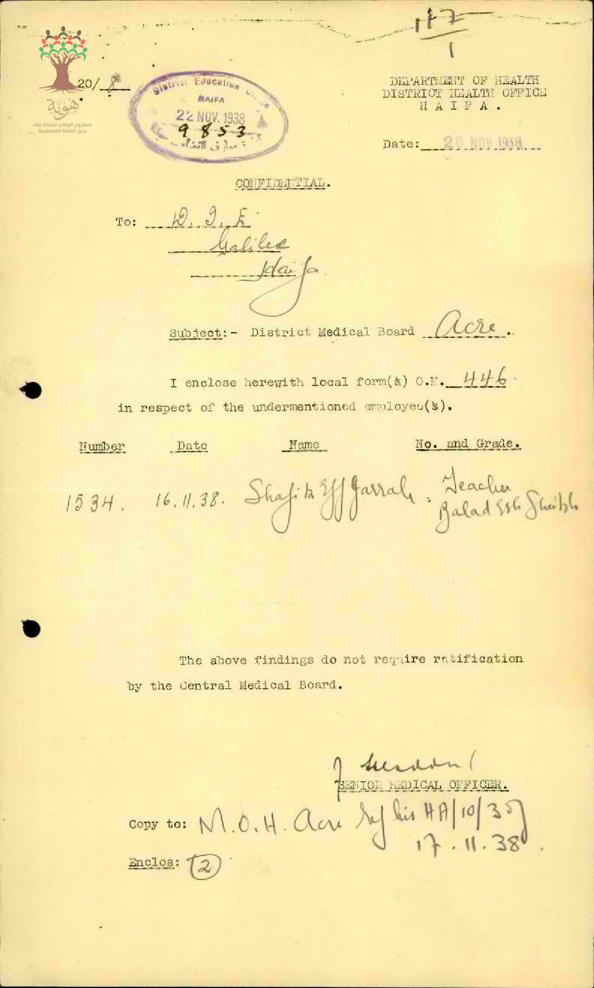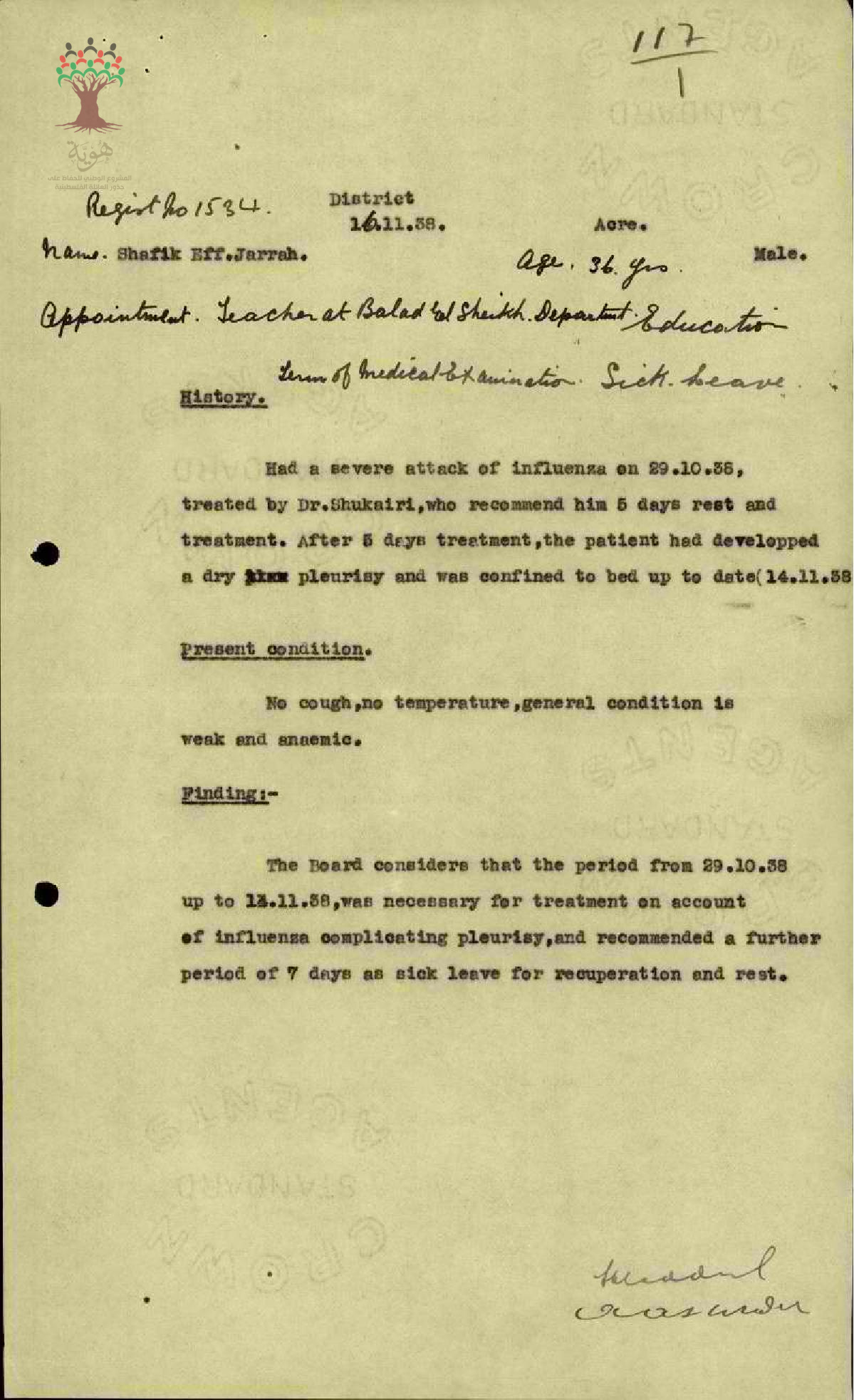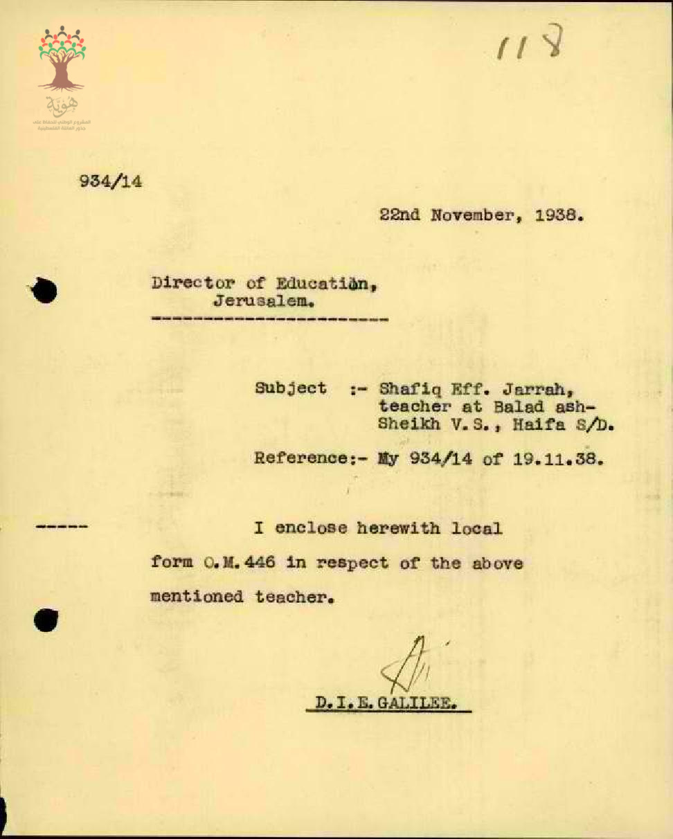 رسالة من مفتش المعارف الى مدير المعارف مرفقة بتقرير مفصل عن مرض المعلم شفيق جراح