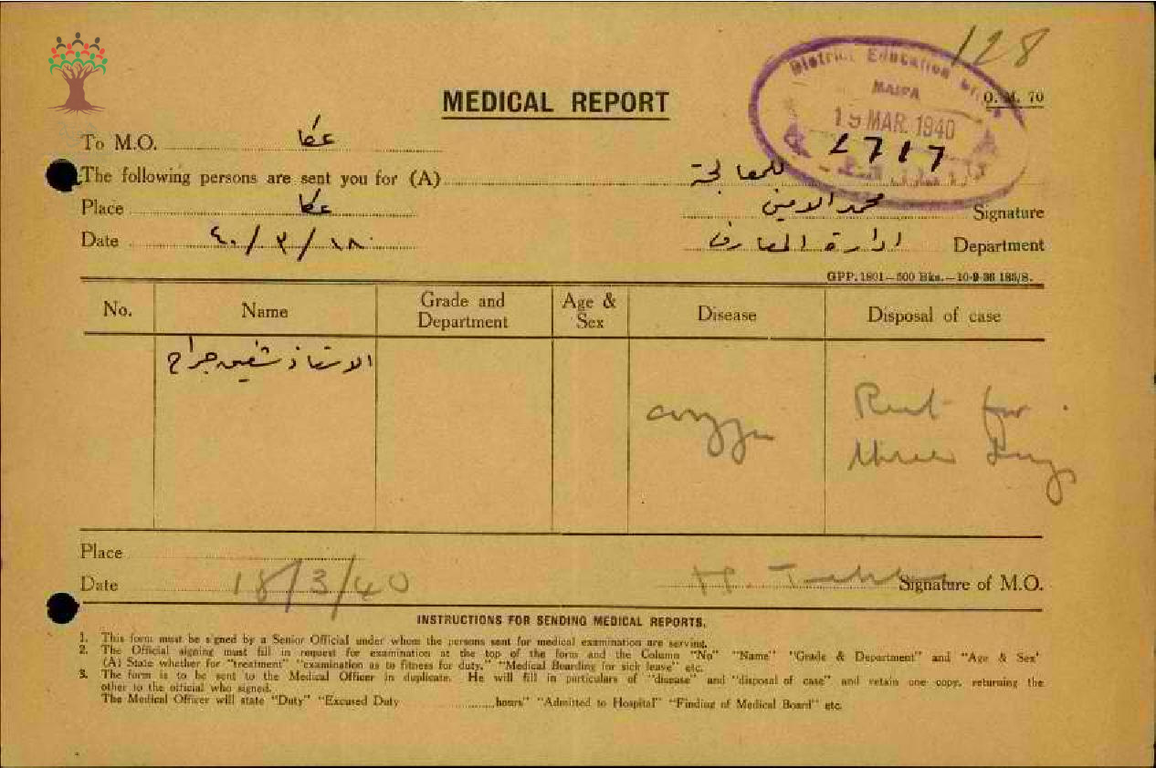 تقرير طبي عن غياب المعلم شفيق جراح-مدرسة المكر