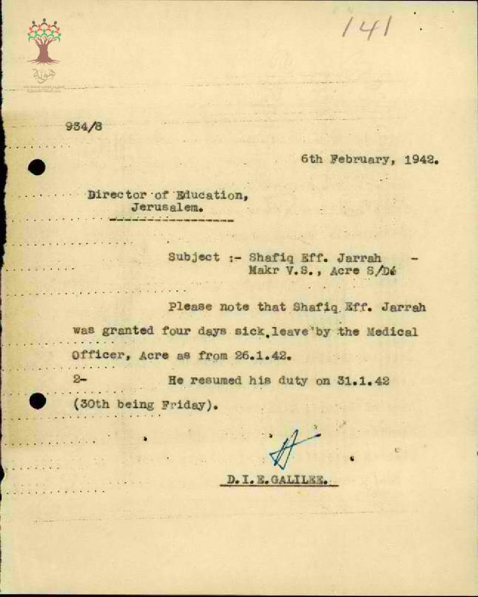 رسالة من مفتش المعارف الى مدير المعارف بخصوص اجازة مرضية للمعلم شفيق جراح وعودته للعمل
