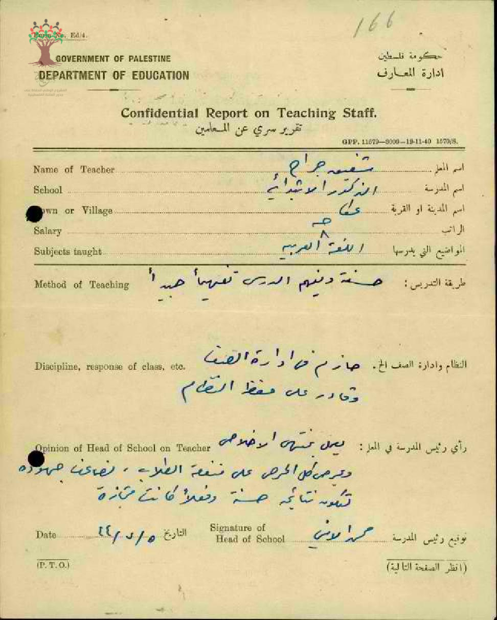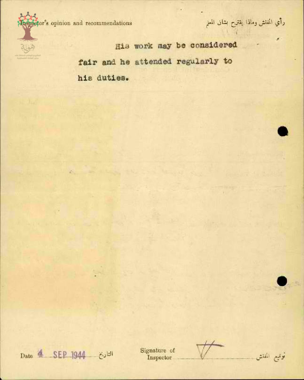 تقرير تفصيلي عن أداء المعلم شفيق جراح في مدرسة عكا سنة 1944