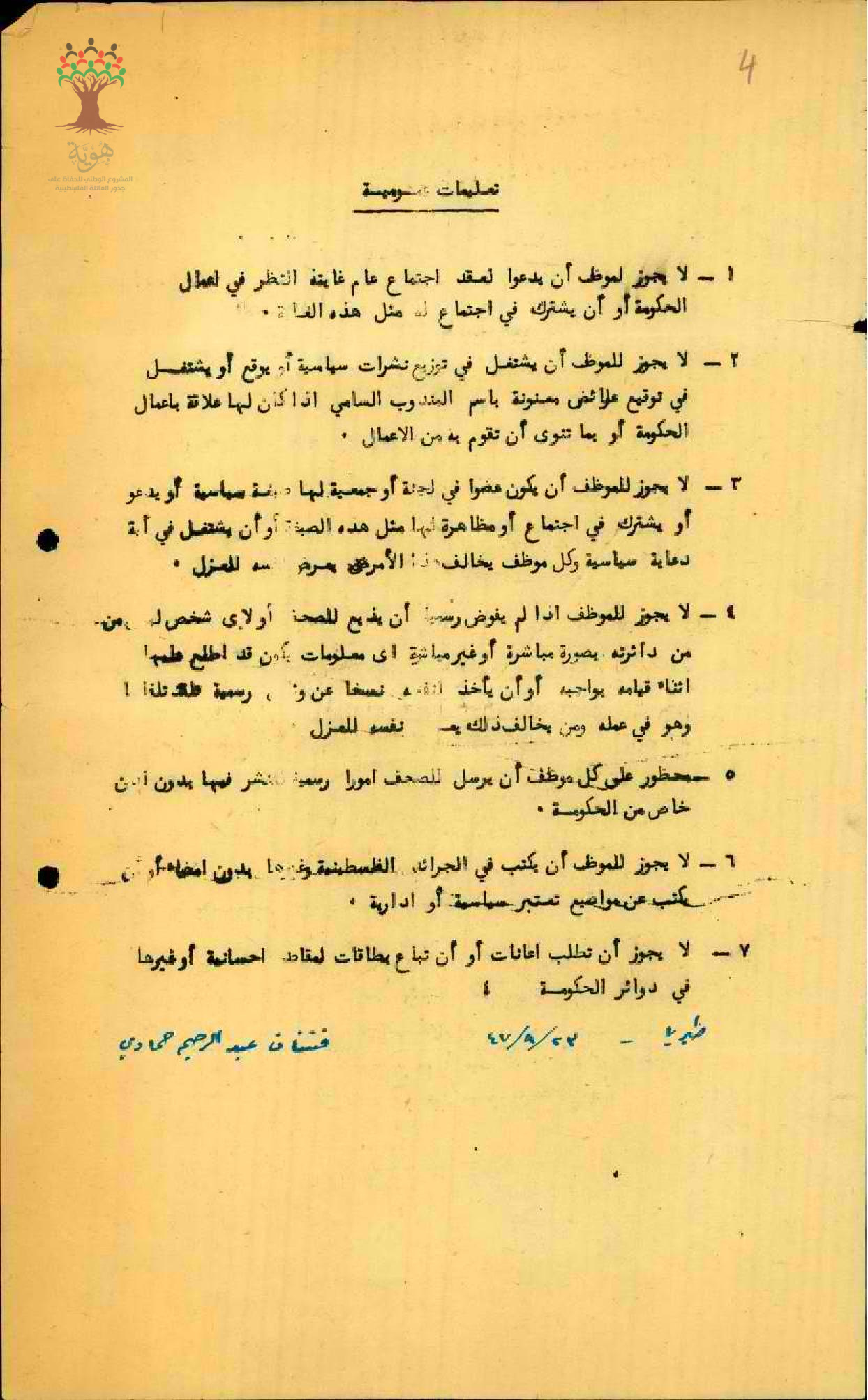 توقيع المعلمة فتنات حمادي على التعليمات العمومية لإدارة المعارف