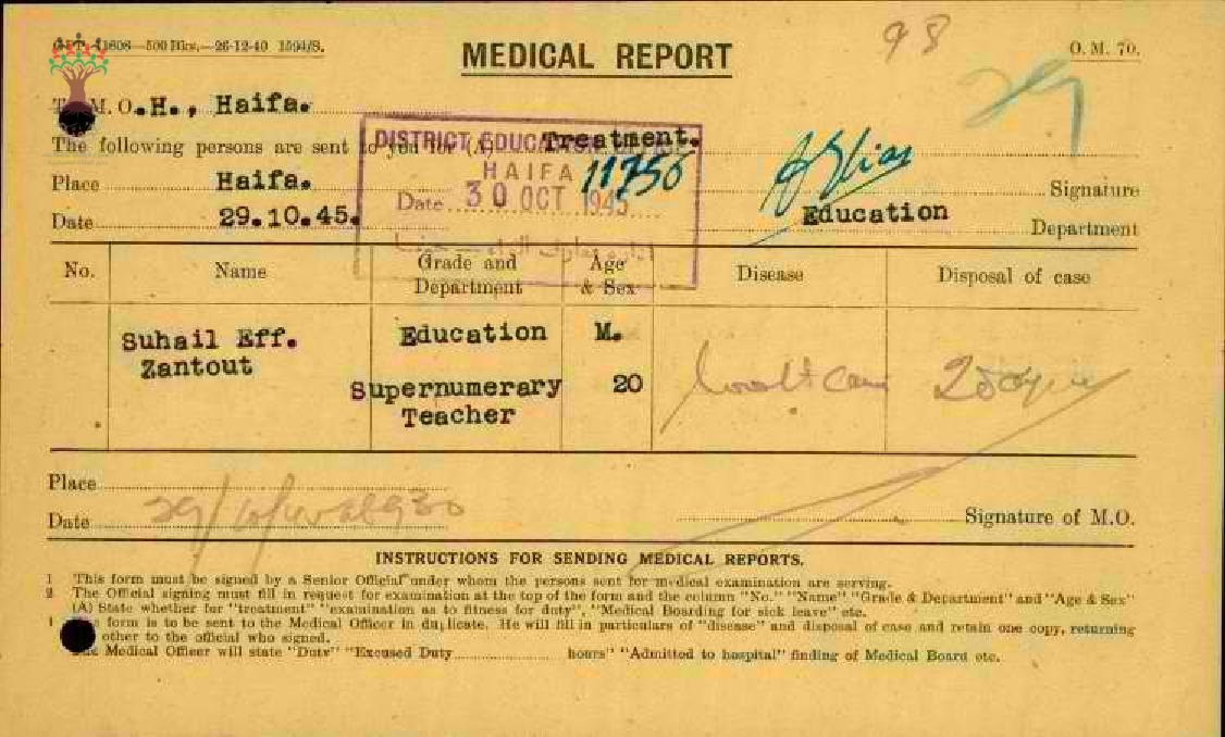تقرير طبي عند غياب المعلم سهيل زنتوت عن المدرسة