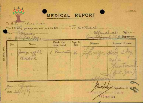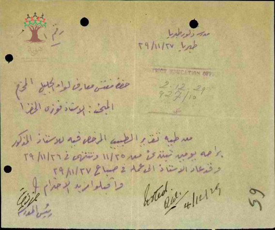 رسالة من مدير مدرسة طبريا الى مفتش المعارف بخصوص تغيب المعلم فوزي الخضرا بسبب المرض مرفقة بالتقرير الطبي وعودته الى العمل