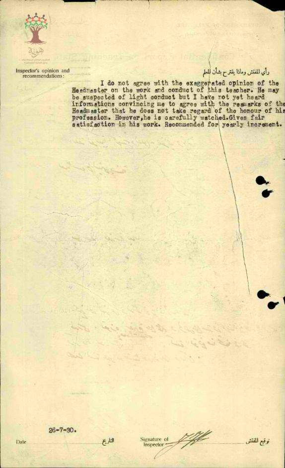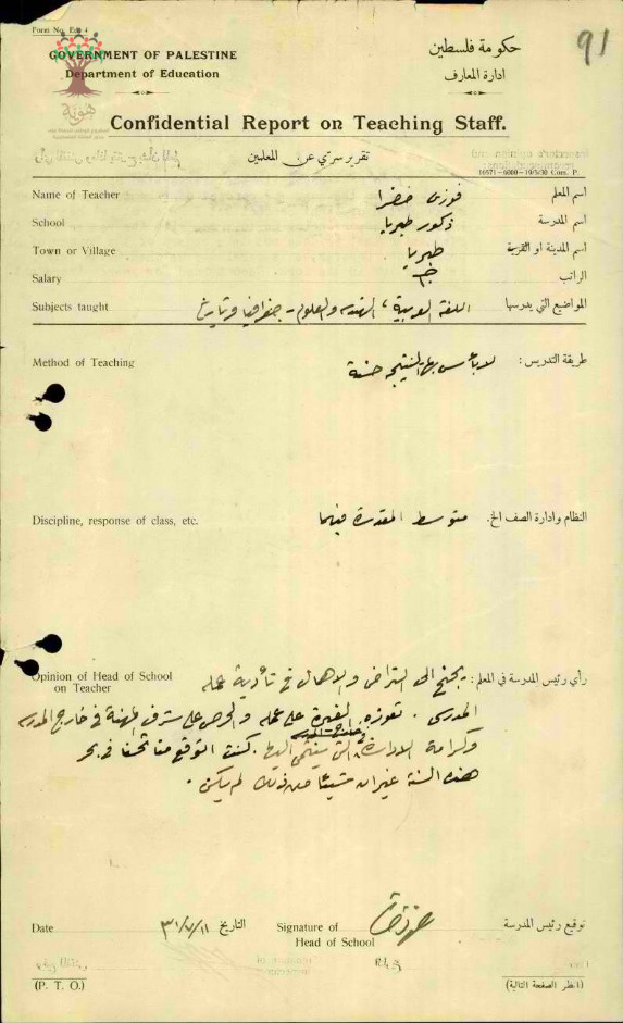 تقرير تفصيلي عن أداء المعلم فوزي محمد الخضرا في مدرسة طبريا سنة 1930