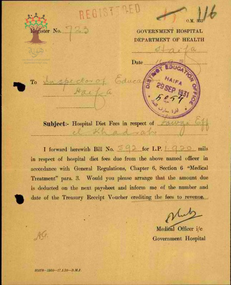 رسالة من طبيب ادارة المعارف الى مفتش المعارف بخصوص تكاليف المستشفى للمعلم فوزي الخضرا