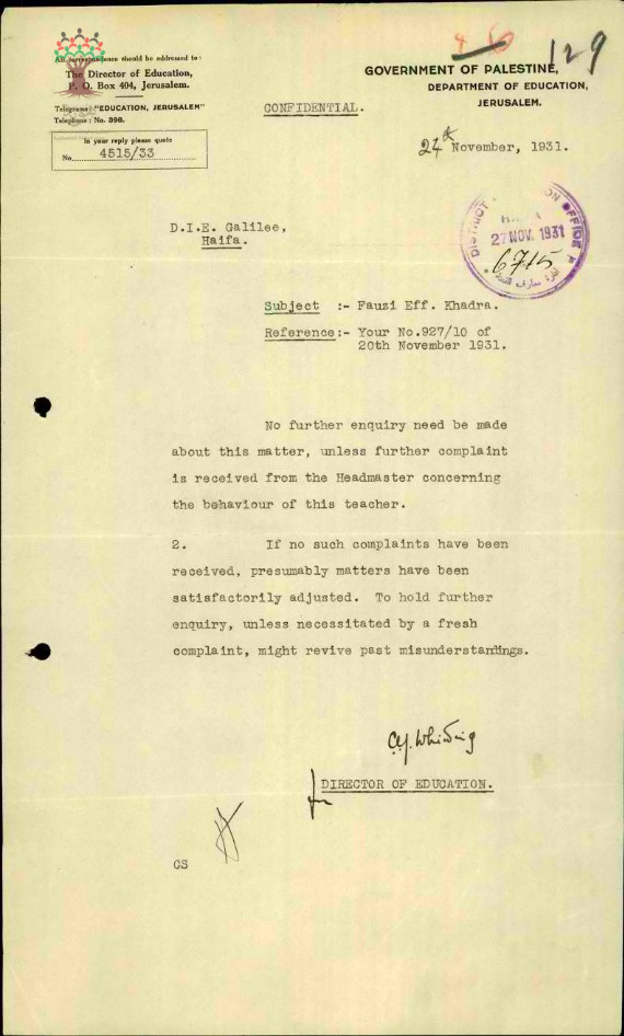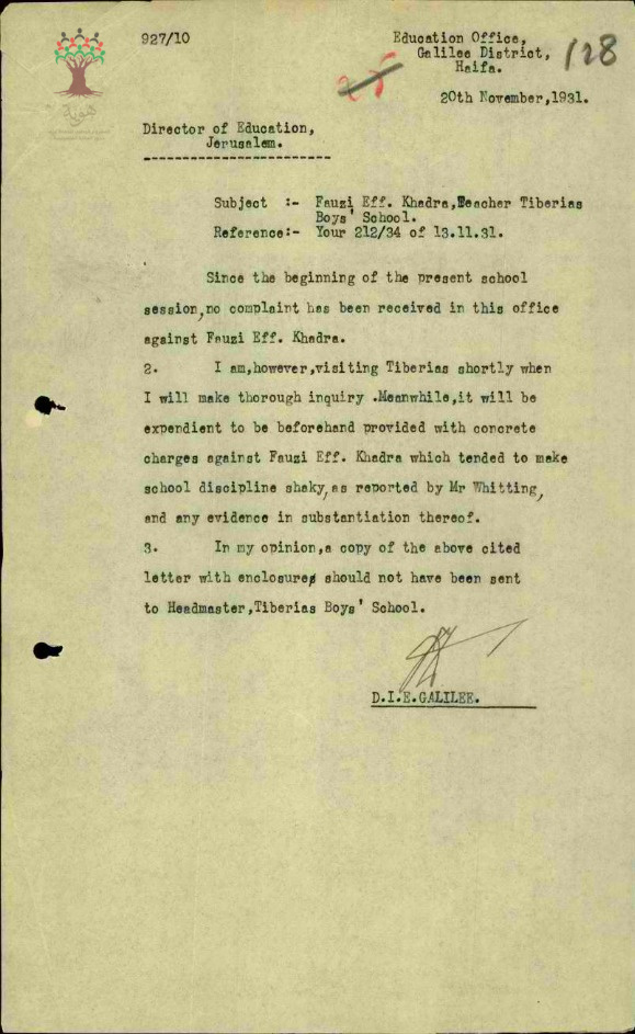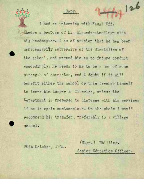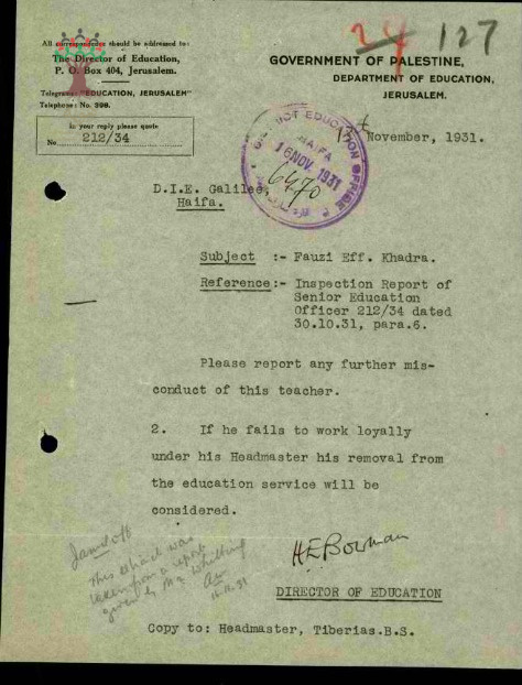 رسائل بخصوص الخلاف بين المعلم فوزي الخضرا ومدير مدرسة طبريا