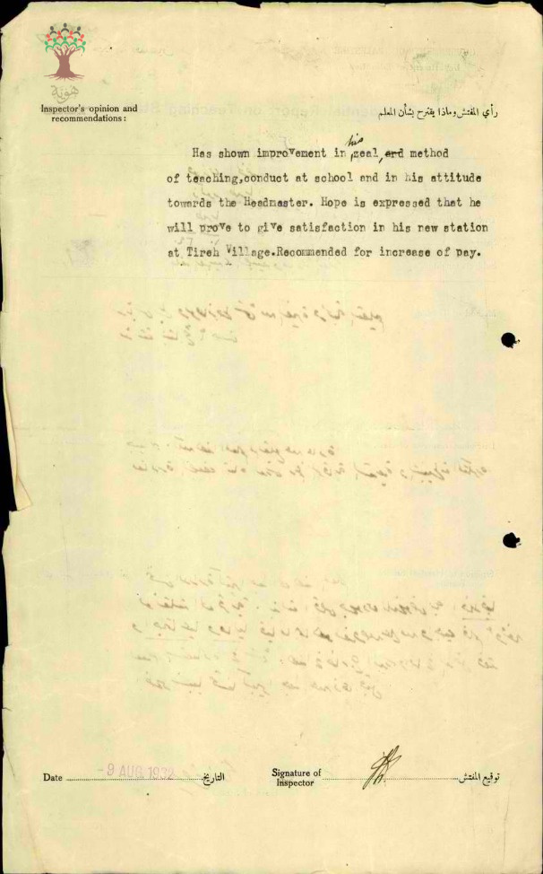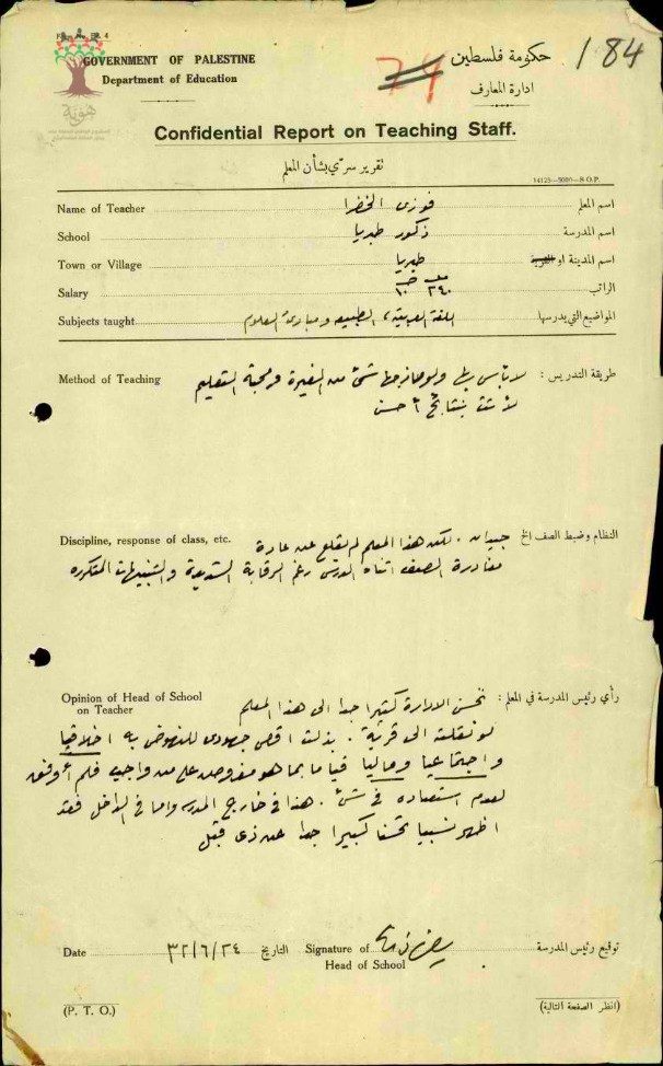 تقرير تفصيلي عن أداء المعلم فوزي محمد الخضرا في مدرسة طبريا سنة 1932