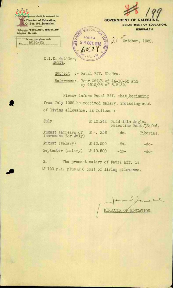 رسالة من مدير المعارف الى مفتش المعارف بخصوص راتب المعلم فوزي الخضرا