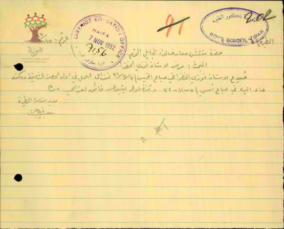 رسالة من مدير مدرسة الطيرة الى مفتش المعارف بخصوص تغيب المعلم فوزي الخضرا بسبب المرض