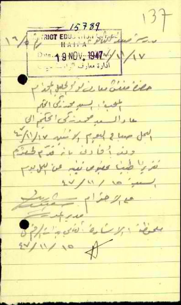 رسالة من مدير مدرسة صفدالثانوية إلى مفتش المعارف بخصوص عودة المعلم محمد زكي الحكيم إلى العمل في المدرسة