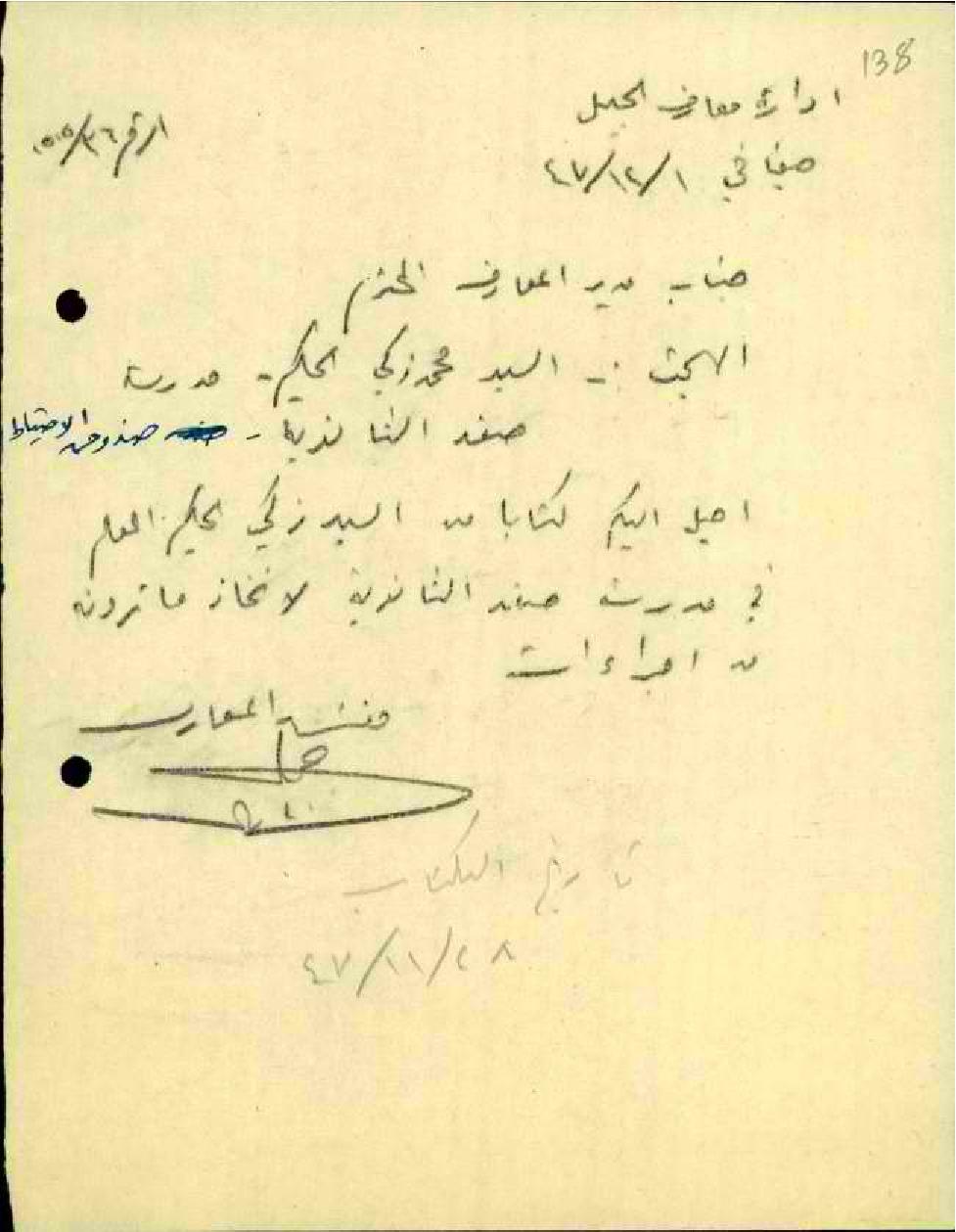 رسالة من مفتش المعارف إلى حضرة مدير المعارف بخصوص صندوق الإحتياط المبحث المعلم محمد زكي الحكيم لإجراء اللازم