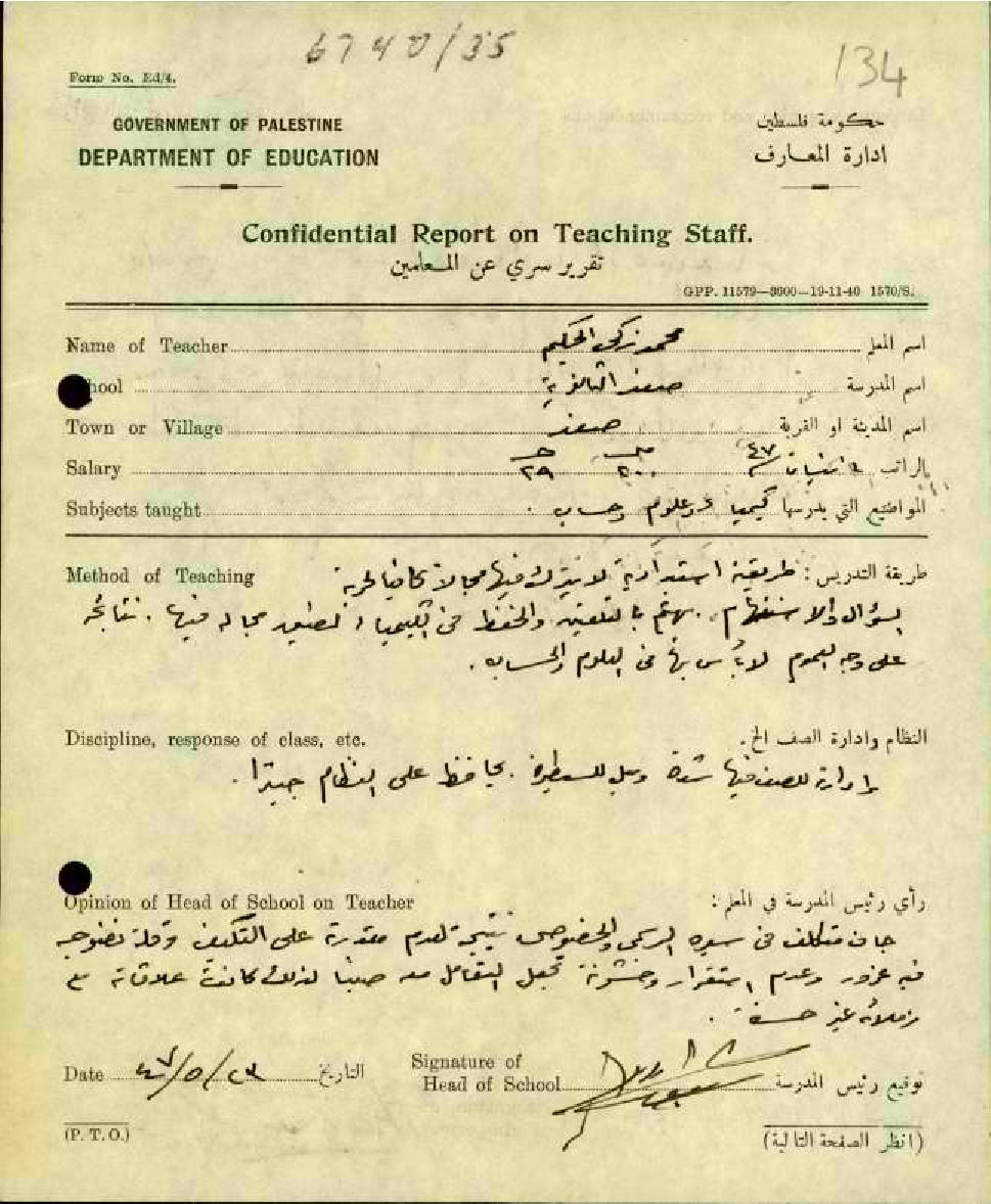 تقرير سري عن المعلمين لدى حكومة فلسطين المبحث المعلم محمد زكي الحكيم