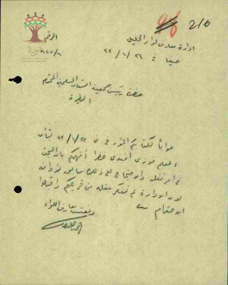 رسالة من مفتش المعارف الى رئيس جمعية الشبان المسلمين يخبره بأنه موضوع نقل المعلم فوزي الخضرا سابق لأوانه