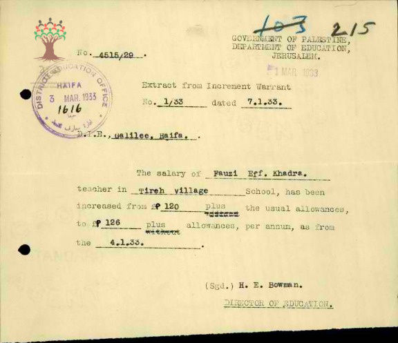 رسالة من مدير المعارف الى مفتش المعارف بخصوص زيادة راتب المعلم فوزي الخضرا السنوية