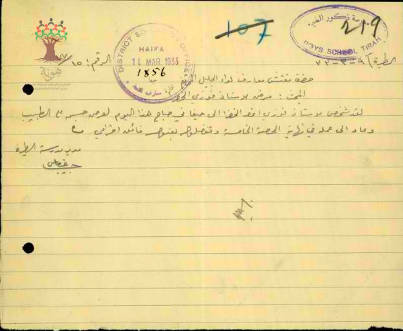 رسالة من مدير مدرسة الطيرة الى مفتش المعارف بخصوص تغيب المعلم فوزي الخضرا بسبب المرض وعودته الى العمل