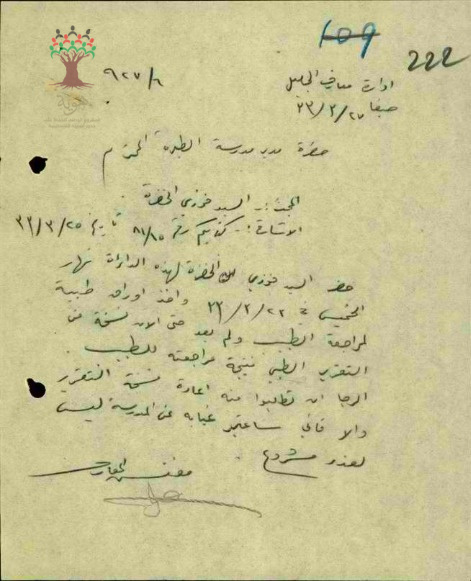 رسالة من مفتش المعارف الى مدير مدرسة الطيرة يطلب فيها نسخة عن التقرير الطبي لتغيب المعلم فوزي الخضرا