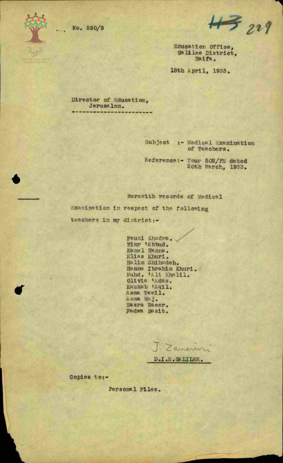 رسالة من مفتش المعارف الى مدير المعارف تتضمن السجل الطبي لعد المعلمين من ضمنهم المعلم فوزي الخضرا