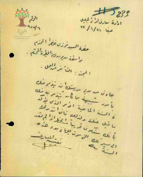 رسالة من مفتش المعارف الى المعلم فوزي الخضرا بخصوص تأخره عن العمل