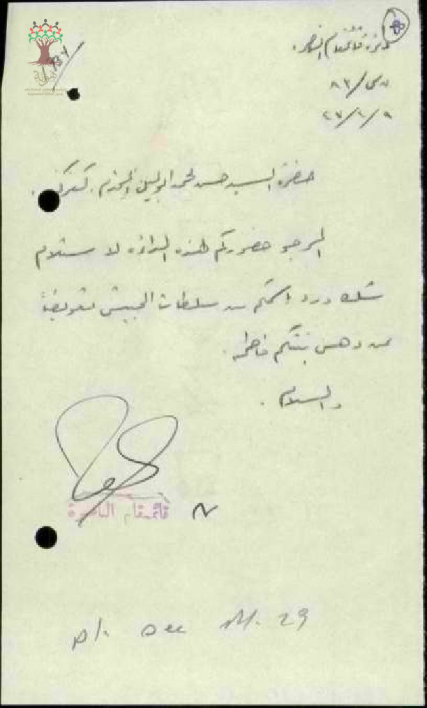 حسن أبو ليل يتسلم 10 جنيه من دائرة التعويضات كمساهمة في تكاليف جنازة ابنته فاطمة حسن أبو ليل التي دهست بسيارة تابعة للجيش البريطاني