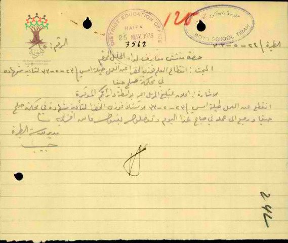 رسالة من مدير مدرسة الطيرة الى مفتش المعارف بخصوص تغيب المعلم فوزي الخضرا لتأدية شهادة في محكمة صلح حيفا