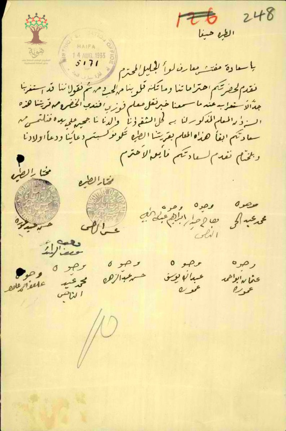 رسالة من وجوه ومخاتير قرية الطيرة الى مفتش المعارف يطلبون فيها ببقاء المعلم فوزي الخضرا في قريتهم