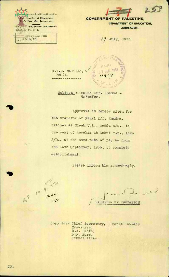 رسالة من مدير المعارف الى مفتش المعارف يخبره بالموافقة على نقل المعلم فوزي الخضرا من مدرسة الطيرة الى مدرسة الكابري